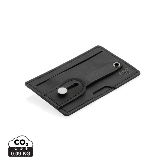 PU material RFID card wallet that can also be used as phone holder and stand. This RFID cardholder can fit up to 2 bank cards or ID cards and will keep them protected from unauthorised scans and fraudulent activities. The adhesive tape on the back allows you to stick the cardholder to a mobile with a flat surface. The item has a strap that functions both as a holder and as a stand.
