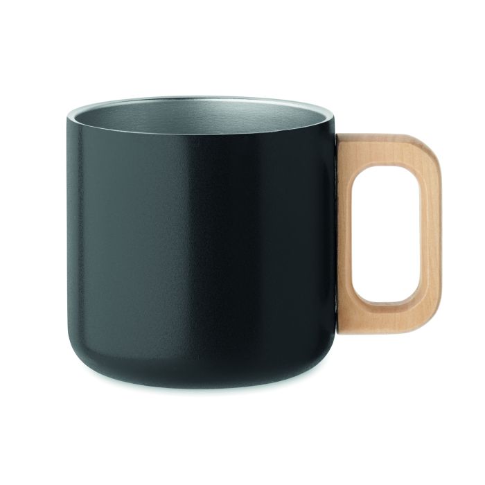 Cană cu perete dublu din oțel inoxidabil reciclat (90% oțel inoxidabil reciclat și 10% oțel inoxidabil), cu mâner din lemn. Capacitate: 350 ml.