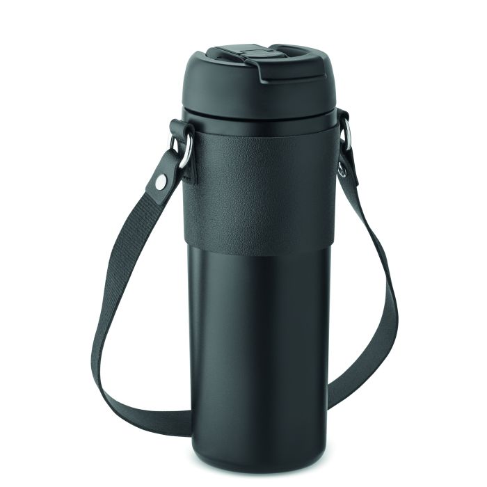 Pahar cu perete dublu din pulbere oțel inoxidabil, capac din PP (capac cu pai 2 în 1) și curea de transport din PU. Fără scurgeri. Capacitate: 700 ml.