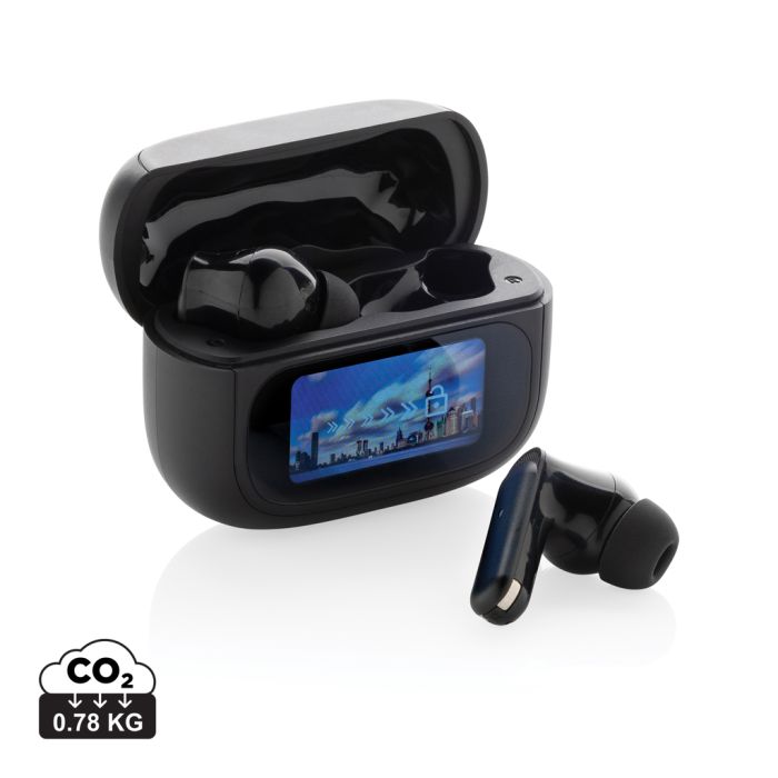 Commute, work or travel in silence with these ANC earbuds. The ANC function makes sure outside noise is reduced for optimal concentration. The charging case comes with an integrated TFT touch screen which offers many unique features: find your earbuds, adjust volume, select next song, answer calls and change language (select between 8 languages) and many more. The earbuds and charging case are made with RCS (Recycled Claim Standard) certified recycled ABS. Total recycled content: 43% based on total item weight. RCS certification ensures a completely certified supply chain of the recycled materials. The earbuds use BT 5.3 for automatic pairing without any hassle and a stable connection. The earbuds have a 30 mAh battery that allows a play time of up to 6 hours (with ANC) and can be re-charged in 1.5 hours in the charging case. ANC degree: 23 DB. Including 3 size eartips. IPX 4 waterproof. With ENC microphone for clear calls. Packed in FSC kraft box.
