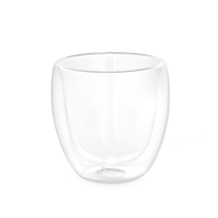 Pahar din sticlă borosilicată cu perete dublu izolat cu aer și capacitate de până la 220 mL. Furnizat într-o cutie de cadou personalizabilă. ø80 x 86 mm