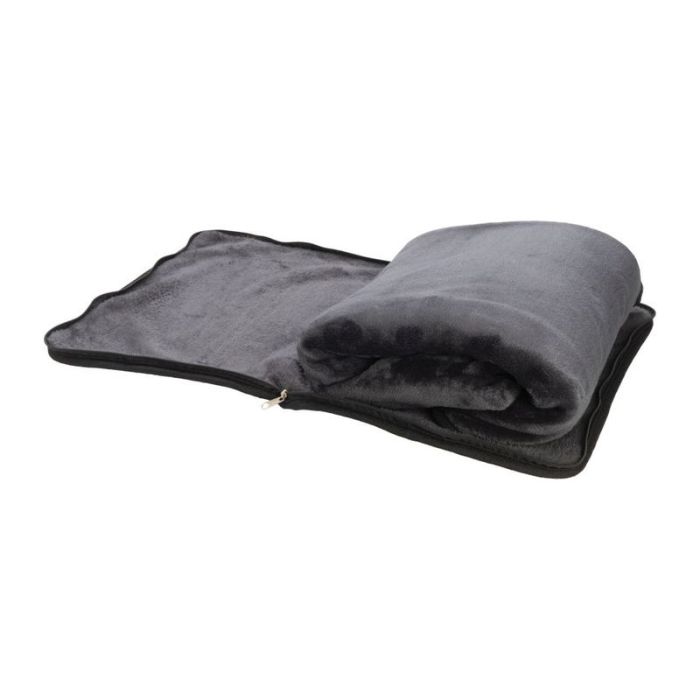 Schwarzwolf 2in1 fleece travel blanket that can be used as a blanket or folded into a cover made of the same material and turned it into a comfortable pillow. The blanket is made in dark gray and can be used during your travels or packed as a companion during camping. The cover for the folded blanket includes a carabiner for attaching to your luggage.
