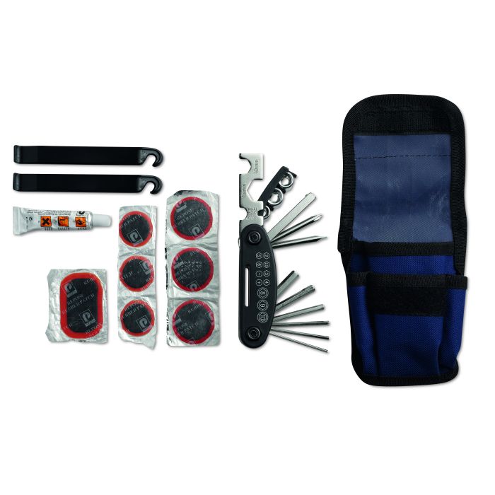 Set pentru reparat bicicleta cu 15 piese, 2 manete pentru anvelope, răzătoare, lipici și petice. Include o husă cu tiv reflectorizant.