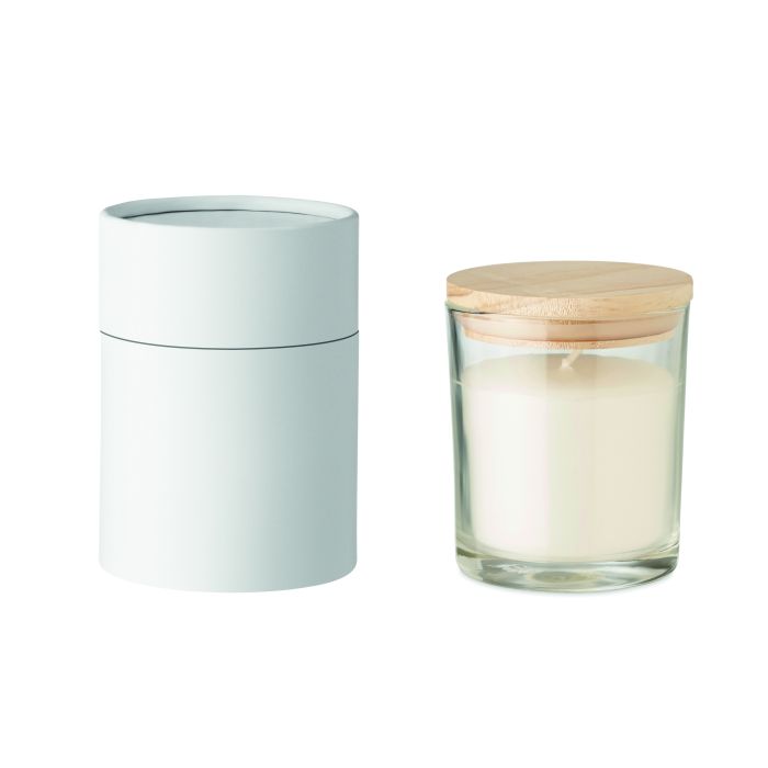 Lumânare de ceară cu parfum de vanilie 120gr, din sticlă cu suport din bambus, în cutie cadou de hârtie. Diametru de 7 cm. Timp de ardere: 20 de ore.