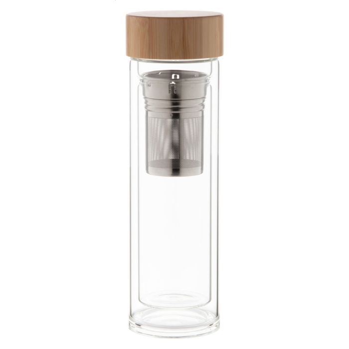 Sticlă borosilicată, termică, cu perete dublu, cu infuzor de ceai și capac de bambus. 420 ml.