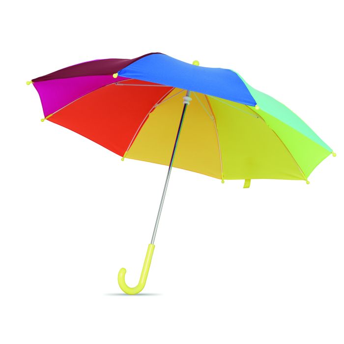 Umbrelă pentru copii de 2,5 cm din 190T pongee cu model curcubeu. Are 8 panouri. Deschidere și închidere manuală. Spițe și cadru din fibră de sticlă. Mâner și vârfuri din plastic. Mâner curbat.