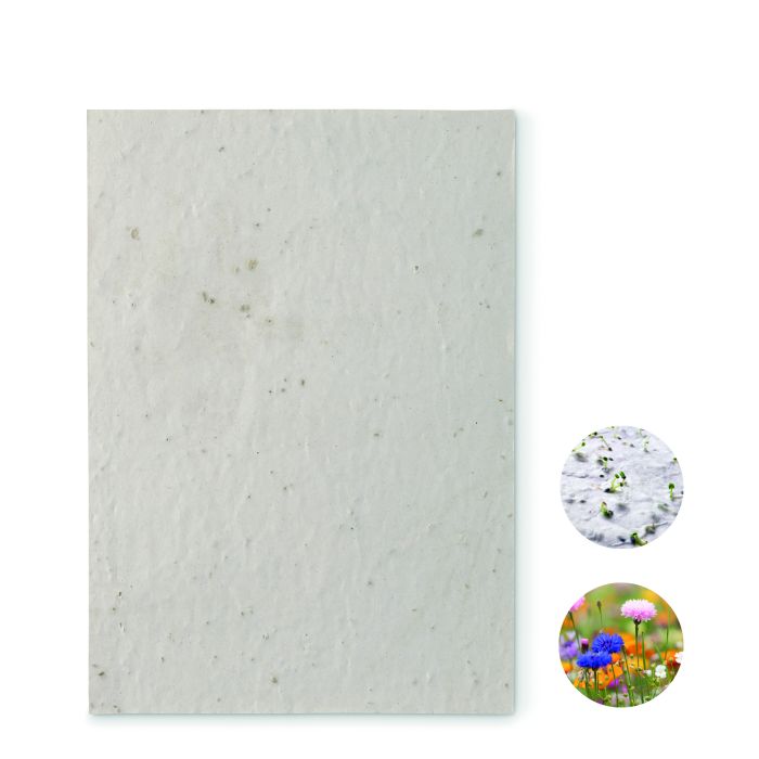 Foaie de hârtie reciclată cu semințe de flori sălbatice în format A5 (80 gr/m²). Fabricată în UE.