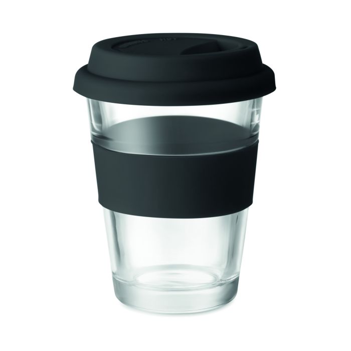 Pahar de sticlă cu capac și prindere din silicon. Capacitate 350 ml. Întrucât acesta este un pahar cu un singur perete poate pierde căldură.
