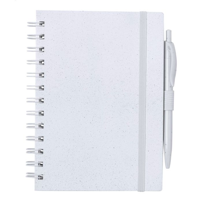 Caiet cu spirală, acoperit cu ABS reciclat, cu 70 de foi dictando din hârtie reciclată. Cu inele spiralate de culoare asortată, curea de cauciuc și suport pentru pix. Include un pix din plastic ABS reciclat cu mină albastră.