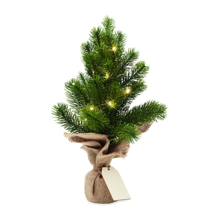 Mini brad de Crăciun din plastic (PE) cu 20 de luminițe galbene calde cu LED pe bază de iută. Funcționează cu 2 baterii AA, furnizat fără baterii.