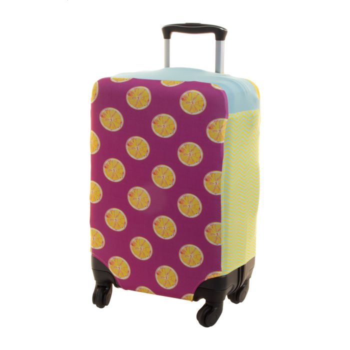 Husă de bagaje din poliester, cu închidere cu velcro. Se potrivește valizelor de dimensiuni mici de până la 50x70x30 cm. Cu grafică imprimată prin sublimare. MOQ: 25 buc.