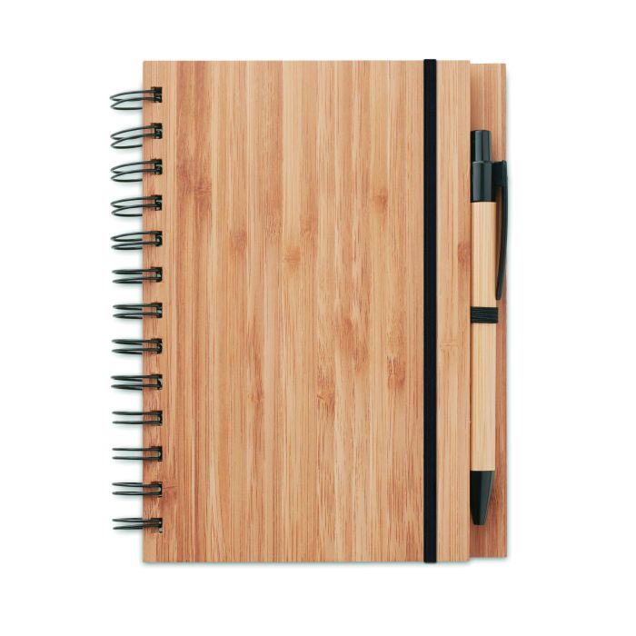 Caiet cu copertă din bambus și pix asortat. Cu spirală. 140 de pagini simple (70 de file) din hârtie reciclată. Pix cu buton asortat, cu corp din bambus și accesorii din ABS. Buclă elastică pentru pix. Bambusul este un material natural, culoarea poate varia de la un produs la altul. FSC®-certified | FSC 100%, N5.7, FSC-C213206
