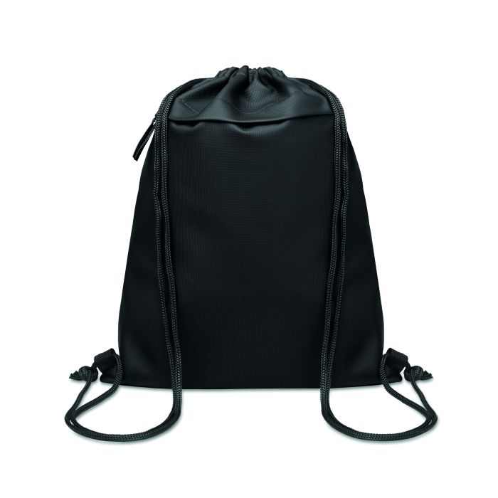 Rucsac cu cordon din poliester 600D RPET acoperit cu PU și căptușeală din poliester 190T RPET. Buzunar frontal cu fermoar.