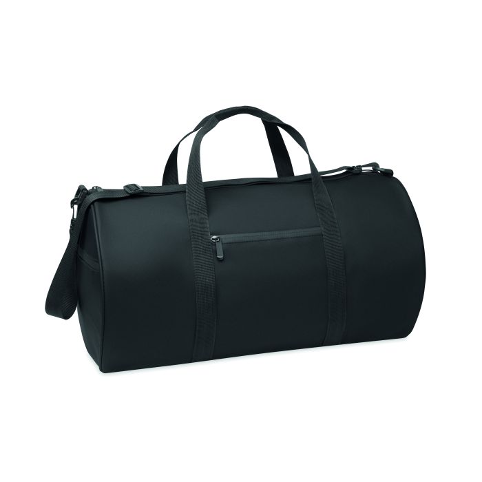 Geantă duffle din poliester 600D RPET cu strat PU. Buzunar frontal cu fermoar. Căptușeală interioară din poliester RPET 210D. 1 compartiment lateral cu fermoar / 1 compartiment lateral cu plasă. Buzunar cu fermoar în interior.