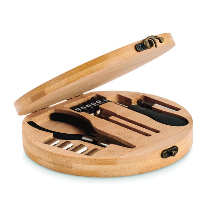 Set de unelte prezentat într-o casetă din bambus care conține 6 capete surubelnite în suport, 3 cu fantă, 2 Philips (PH1, PH2) și 1 adaptor, 4 prize, 1 mâner, 1 conector, 1 clește și 2 șurubelnițe de precizie. Bambusul este un produs natural, în consecință pot apărea diferențe de culoare, dimensiune sau desen. FSC®-certified | FSC 100%, N5.7, FSC-C213206