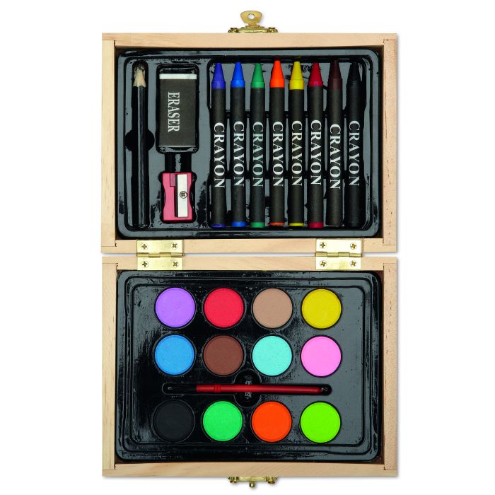 Set pentru pictură în cutie de lemn. Conține 8 creioane cerate, 12 acuarele, 1 pensulă, 1 ascuțitoare, 1 radieră și un creion.