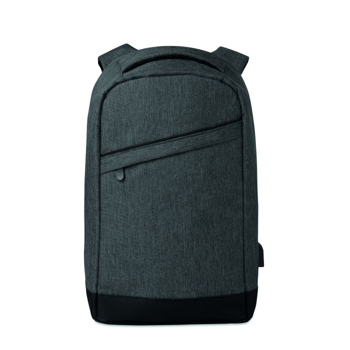 Rucsac din poliester 600D în 2 nuanțe, cu barete de umăr buretate, compartiment principal interior, un compartiment pentru laptop de 13 inchi și un cablu USB. Compartiment principal cu fermoar la spate, pentru protecție sporită.