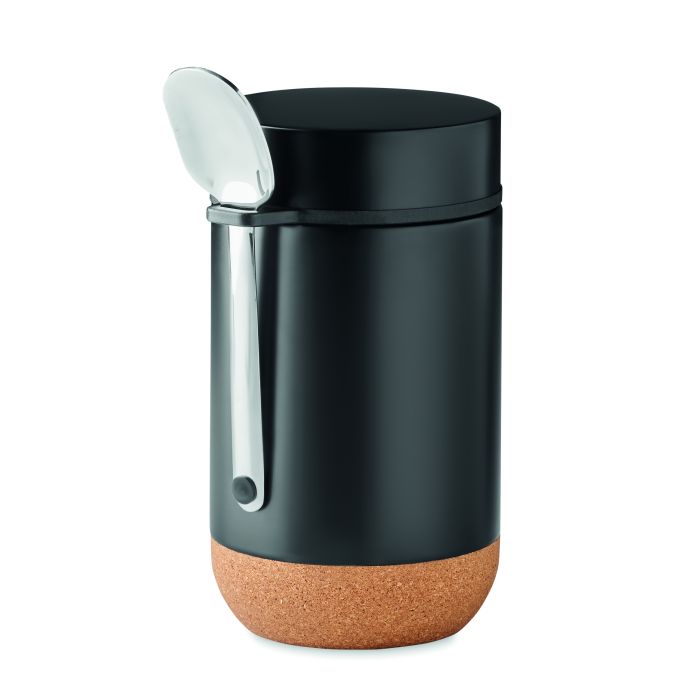 Borcan de depozitare termoizolant din oțel inoxidabil cu perete dublu, cu capac cu șurub și bază din plută. Include lingură. Capacitate: 400 ml. Pluta este un material 100% natural. Din cauza naturii sale structurale și a porozității suprafeței, rezultatul finalal al personalizarii fiecărui articol poate varia.