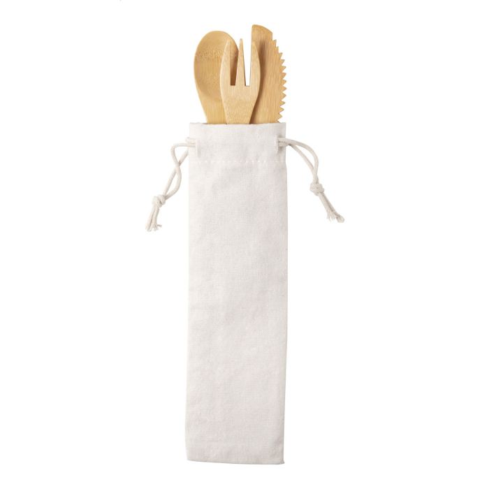 Set 3 buc. tacâmuri din bambus în săculeț de bumbac.