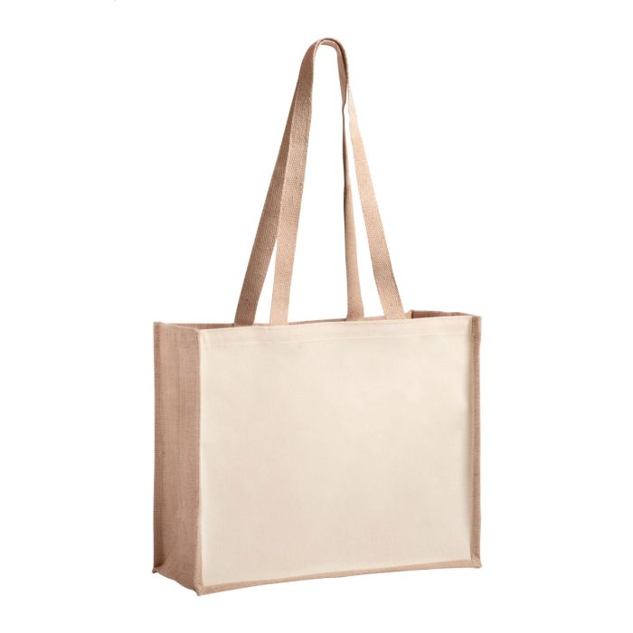 Sacoșă de cumpărături, in combinație de iută laminată și bumbac laminat, cu mânere lungi.