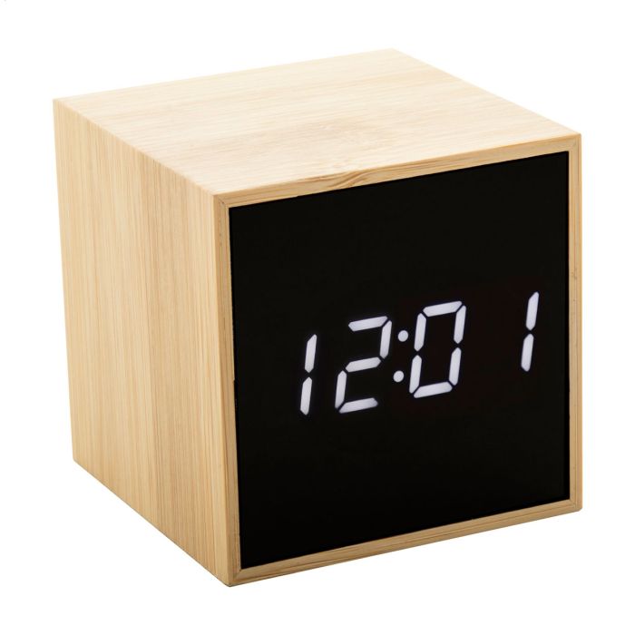 Ceas digital, cu carcasa din bambus, cu alarmă și termometru, afișaj alb cu LED-uri. Poate fi alimentat prin cablul de încărcare USB inclus sau cu 3 baterii AAA (fără baterie).