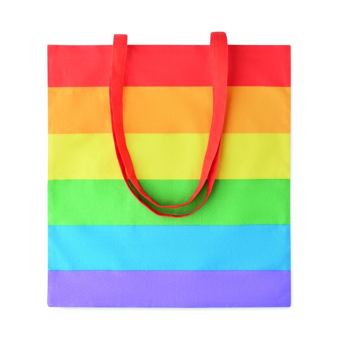 Sacoșă de cumpărături din bumbac de 200 gr/m² cu imprimeu curcubeu și cu mânere lungi. Adăugați puțină culoare mărcii sau mesajului dvs. cu această sacoșă de cumpărături veselă. Această sacoșă este ideală pentru cumpărăturile zilnice. O puteți transporta de mânerele lungi sau o puteți atârna pe umăr pentru a a avea mâinile libere. Limita de greutate este de 2,5kgs. Acest produs este certificat OEKO-TEX® STANDARD 100.