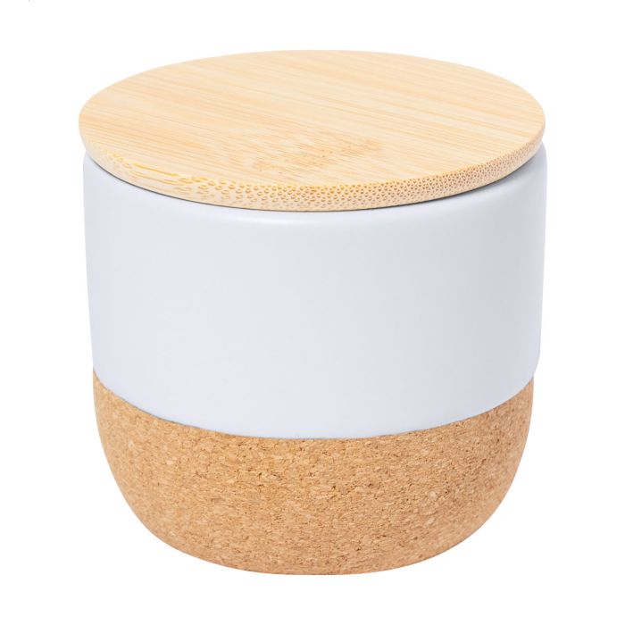Lumânare din ceară pe bază de plante, cu parfum de vanilie, în suport ceramic cu fund din plută naturală și capac din bambus.
