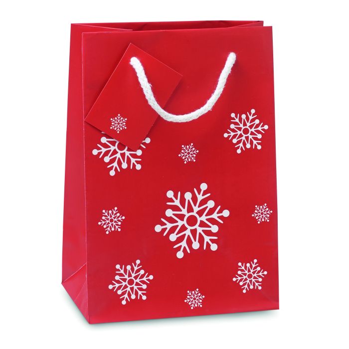 Pungă de cadou cu motive fulgi de nea şi etichetă inclusă. Mărime mică. FSC®-certified | FSC 100%, P5.3, FSC-C213206