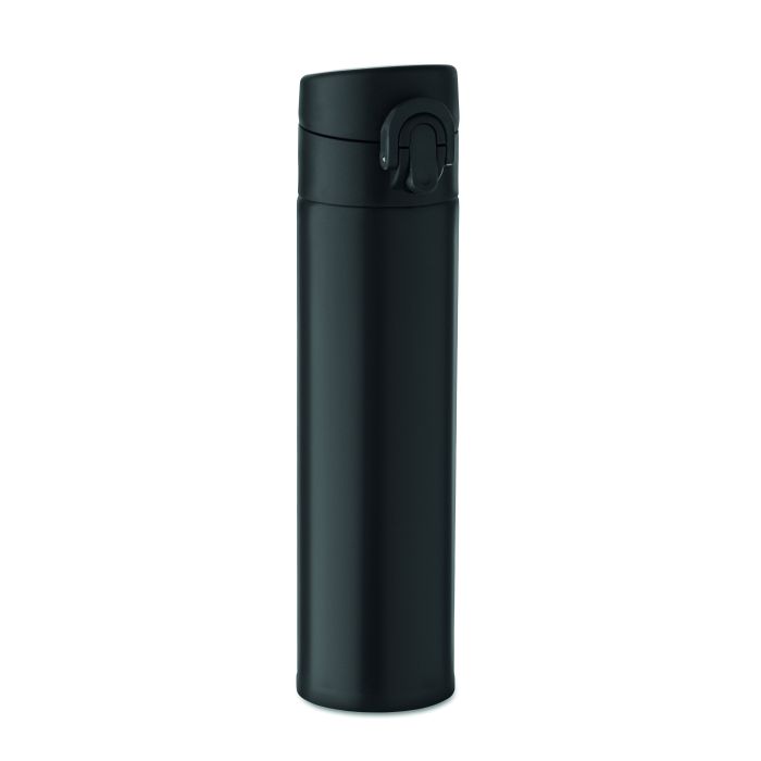 Sticlă de băut cu perete dublu din oțel inoxidabil reciclat (90% oțel inoxidabil reciclat și 10% oțel inoxidabil) cu închidere de siguranță pe capac și opțiune de deschidere prin apăsare. Fără scurgeri. Capacitate: 300 ml.