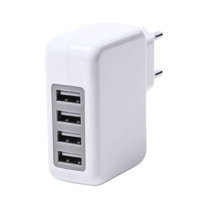 Încărcător de perete din plastic, cu 4 porturi USB, capacitate max 3100 mA.