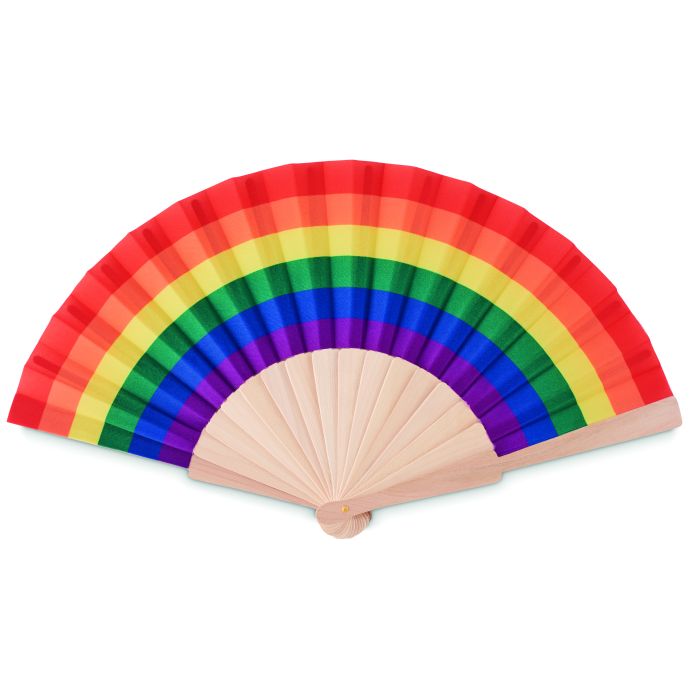 Evantai din lemn și țesătură din poliester cu model curcubeu.
