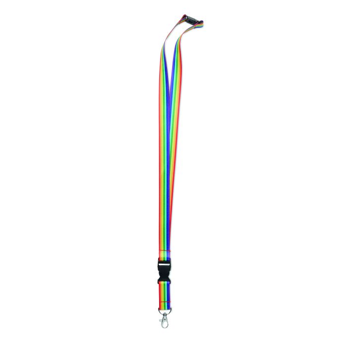 Lanyard RPET curcubeu, cu carabină metalică, cataramă detașabilă și cu sistem de siguranță.