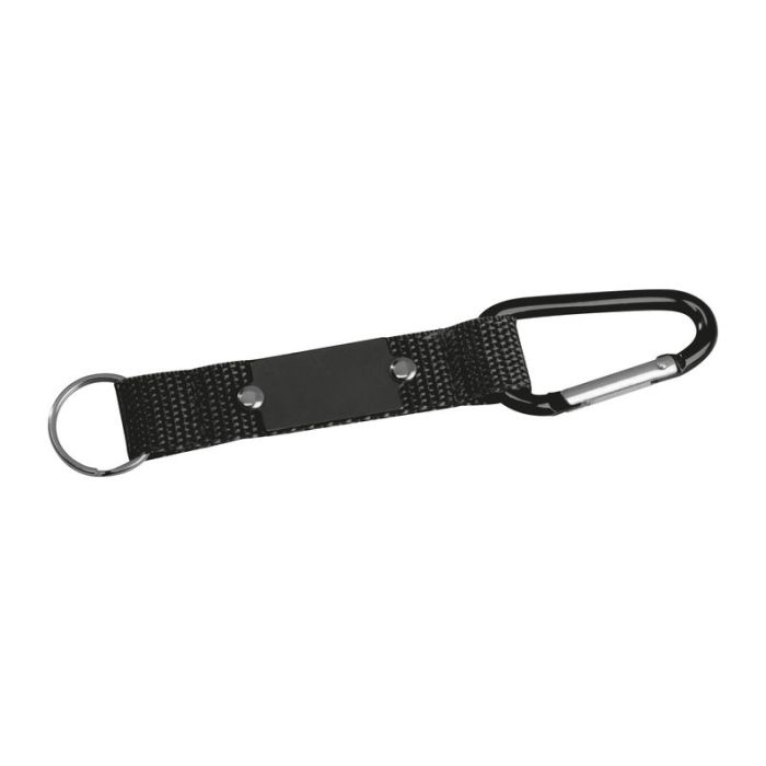 Breloc cu bandă din textil, carabină pe un capăt și inel pentru chei pe celălalt capăt, și placă metalică pentru personalizare.