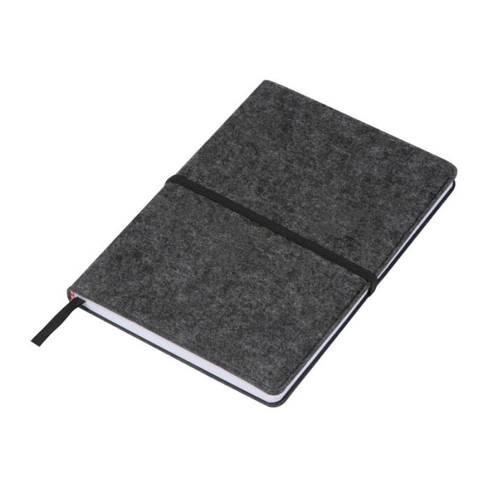 Caiet notes A5 cu copertă din pâslă, 192 de pagini (96 foi)cu pătrăţele, semn de carte și închidere cu elastic.