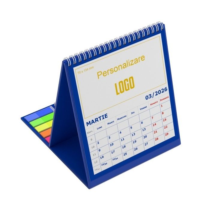 Hârtie 150 gr./mp, 12 file + copertă, policromie, spiră metalică albă; mucava ca 2 mm cașerată hârtie 135 g/mp, print: 1/1, plastifiere mată față/verso; notițe repozitionabile 50 coli, fără print; 5 x 20 semne de carte din folie de plastic – diferite culori;