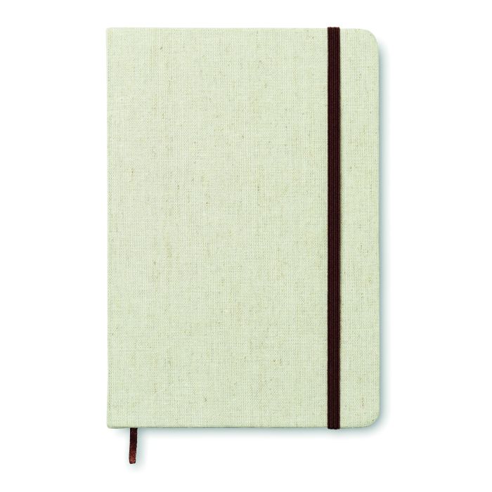 Agendă A5 cu copertă tare canvas. Bloc lipit. 192 pagini liniate (96 file) din hârtie reciclată. Închidere elastică contrastantă și panglică.