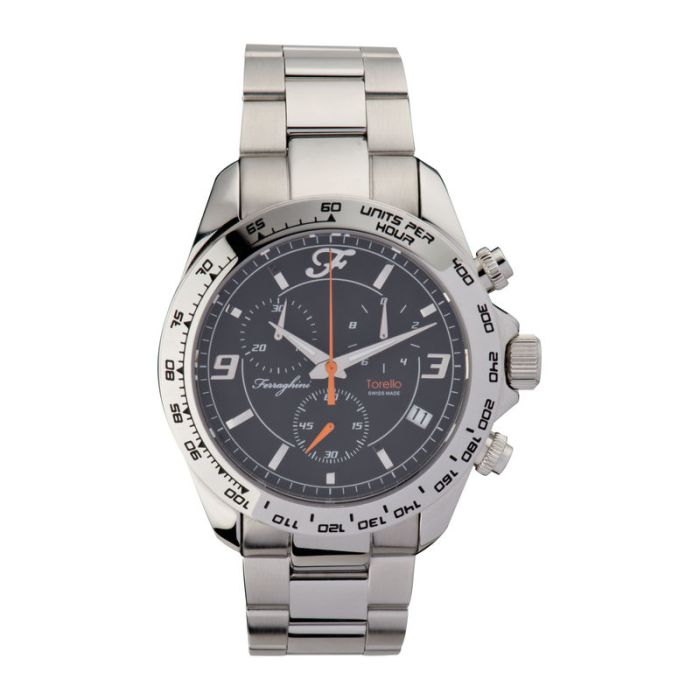 Ceas de mână Ferraghini TORELLO - design clasic, sportiv, fabricat cu precizie elveţiană. Cronograful cu carcasă mare (42mm lat) are toate caracteristicile pentru oamenii sportivi: secundar, cronometru, dată, vitezometru, sticlă de safir, rezistenţă la apă pană la 100 de metri (10 ATM), carcasă hipoalergenică din oţel inoxidabil, brăţară din oţel inoxidabil și închidere cu clapetă.