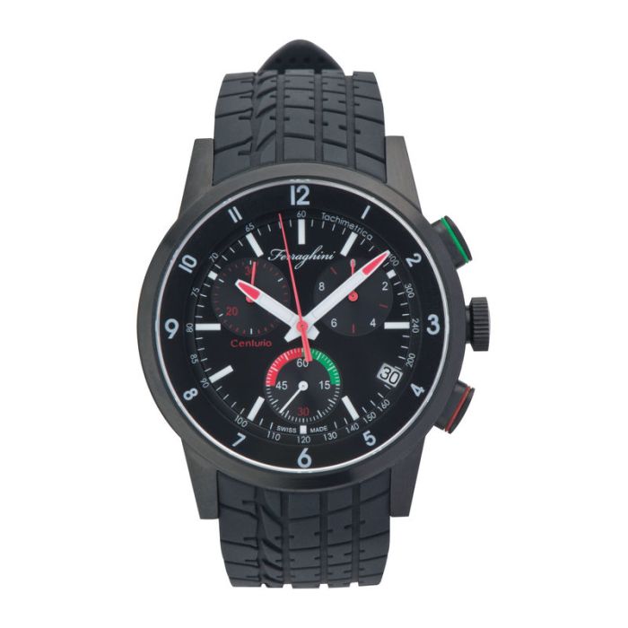 Ceas de mână Ferraghini Centurio - design Italian sportiv fabricat cu precizie elveţiană. Cronograful cu carcasă mare (42mm lat) are toate caracteristicile pentru oamenii sportivi: secundar, cronometru, dată, vitezometru, sticlă de safir, rezistenţă la apă pană la 100 de metri (10 ATM), carcasă hipoalergenică din oţel inoxidabil, brăţară din oţel inoxidabil și închidere cu clapetă.