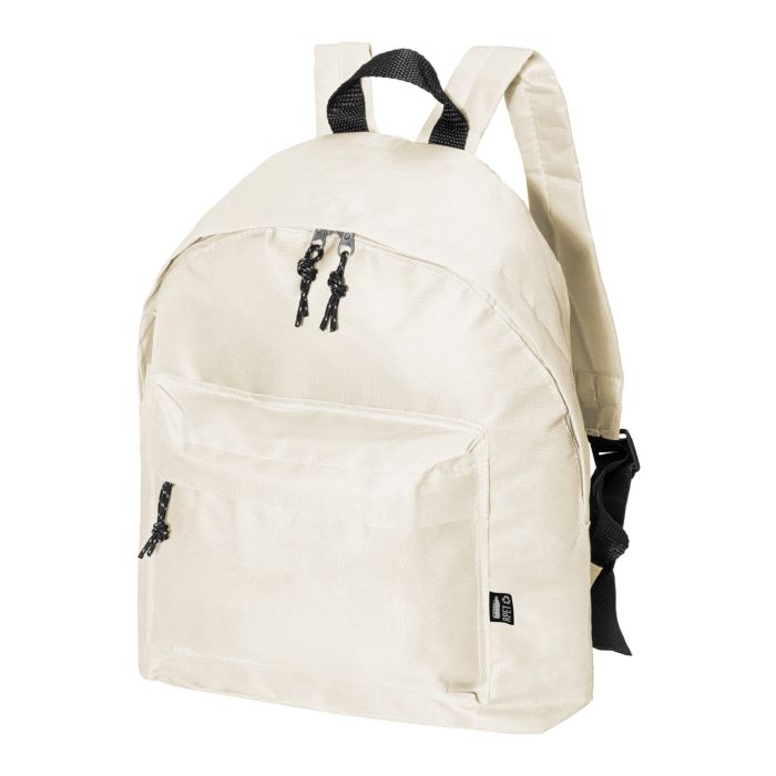 Rucsac RPET cu compartiment principal cu fermoar, buzunar frontal cu fermoar, spate și bretele de umăr căptușite. Poliester 600D RPET, cu etichetă distinctivă RPET.