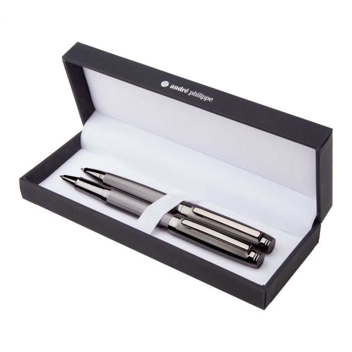 Set elegant de pix și pix roller metalic, cu butoi cu model. În cutie cadou neagră, cu reumplere albastră. Produs marca André Philippe.