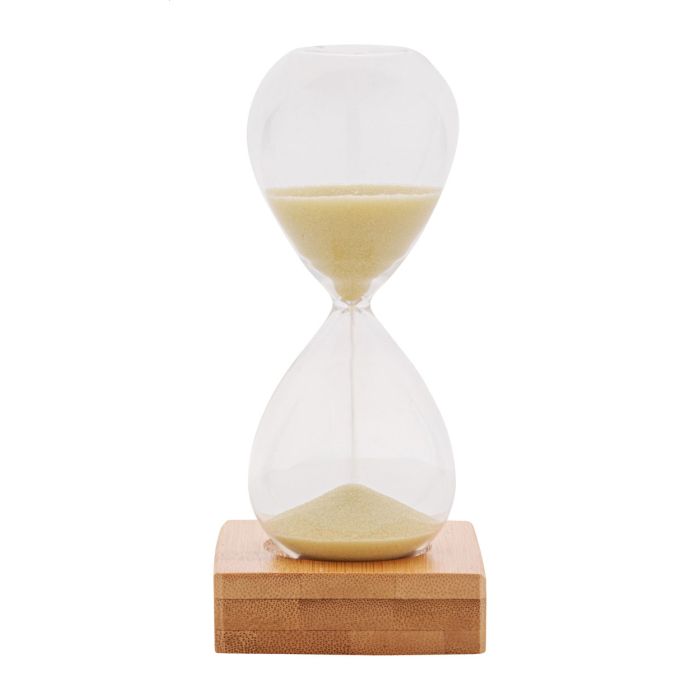 Clepsidră de 5 minute, din sticlă borosilicată, cu nisip, cu bază de bambus. În cutie de hârtie kraft.