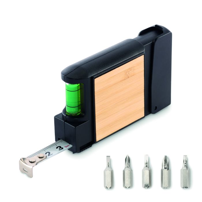 Bandă de măsurare multifuncțională 3M cu detalii din bambus, inclusiv nivel și set de șurubelnițe cu 5 biți.