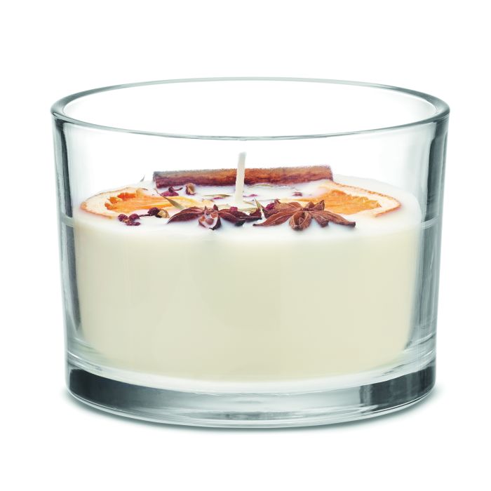 Lumânare parfumată scorțișoară și citrice din ceară pe bază de plante cu flori și fructe uscate în suport de sticlă. 300 gr. Timp de ardere: 50 ore.