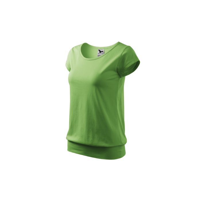 tricou trendy de damă, cu mânecă foarte scurtă, croială lejeră, guler rotund, cu tiv îngust din același material, bandă de întărire la umeri, tricoul este prelungit în partea inferioară printr-o bandă din acelaşi material, aspect plăcut datorită tratamentului cu silicon