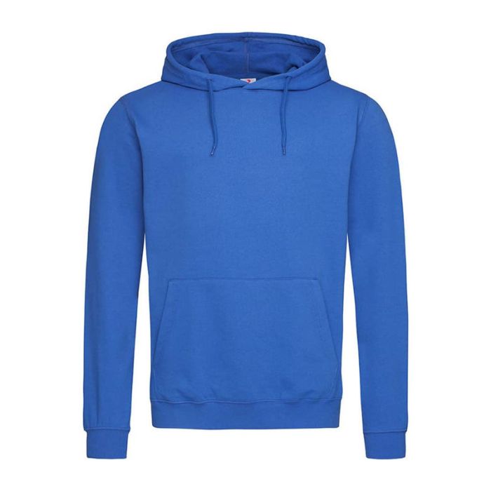 A durable ring-spun cotton-polyester-blend, midweight hooded sweatshirt for men, brushed inside with kangaroo pocket, elastic cuffs and waistband.