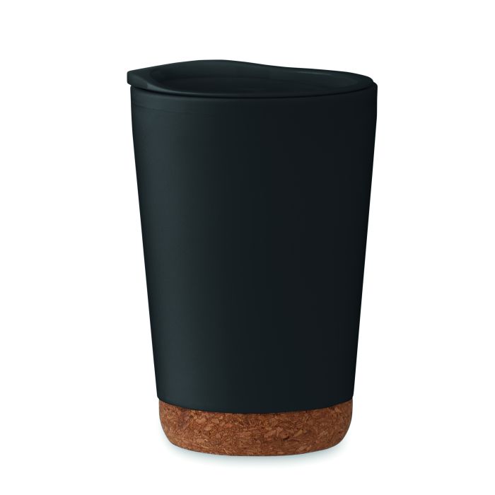 Pahar tumbler cu perete dublu din PP cu bază din plută și capac cu gura de băut cu închidere glisantă din PS. Capacitate: 300 ml.