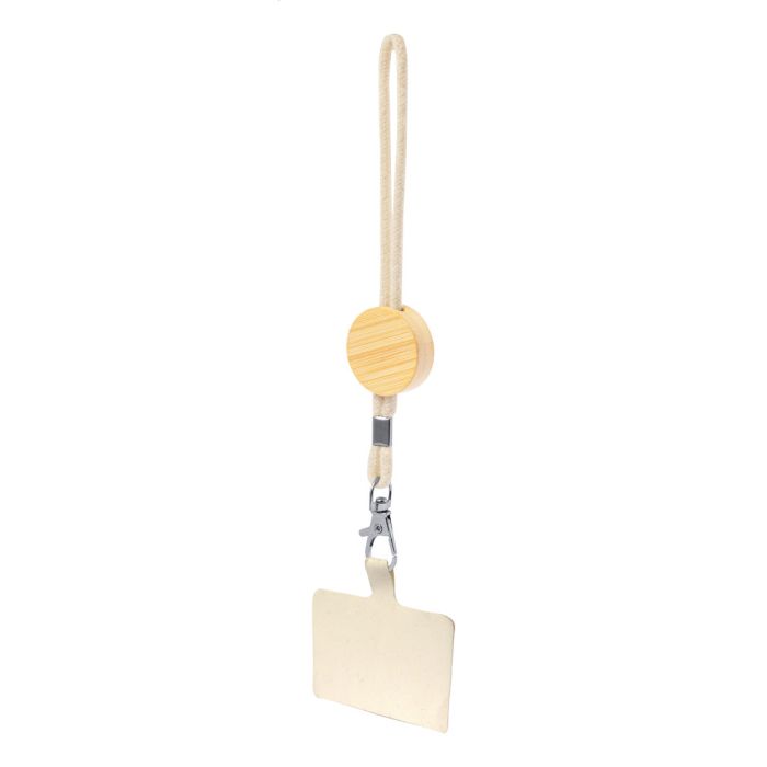 Brățară de mână cu suport telefon mobil, din bumbac, cu etichetă rotundă din bambus, inserție pentru telefon și carabină metalică.