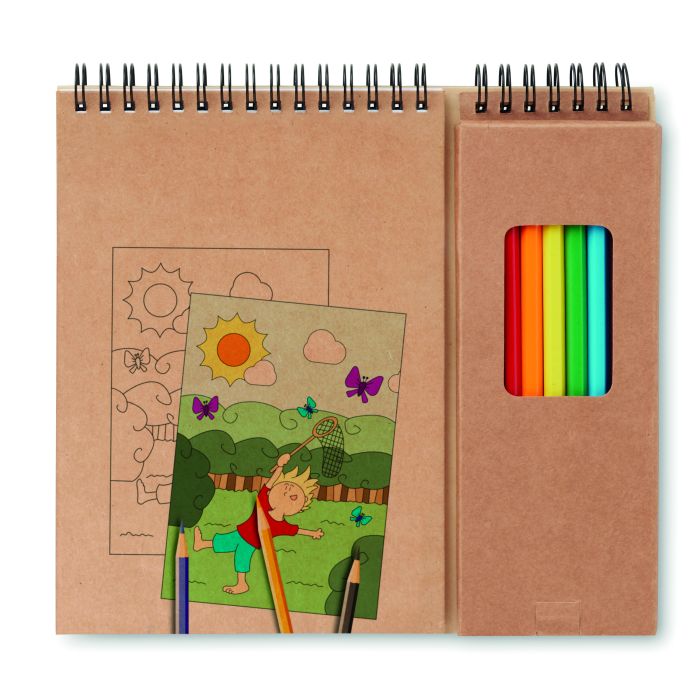 Set de desenat cu carnet cu 24 de pagini, din care 6 pagini de colorat și 18 pagini albe. Include 8 creioane colorate.
