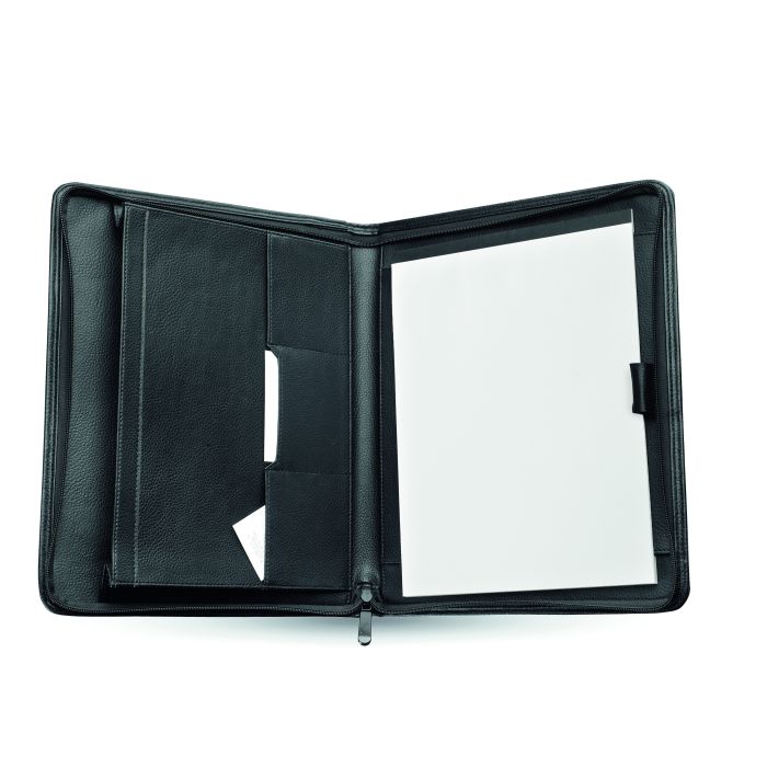 Mapă de conferință A4 cu copertă din piele. Cu fermoar. 25 de file simple. 4 compartimente interne. Suport pentru pix.