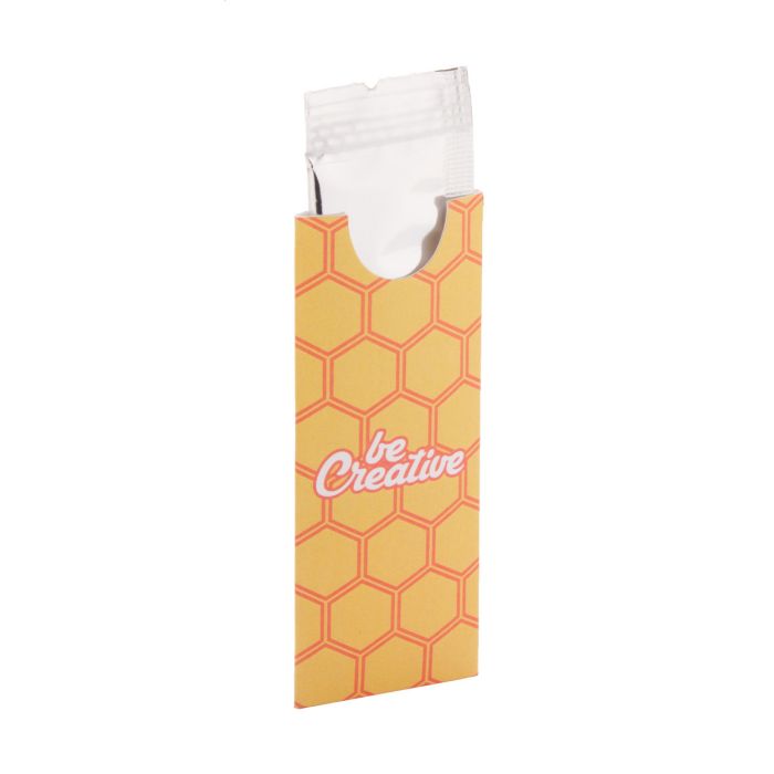 Un singur pachet de miere (10 grame), în husă de hârtie imprimată la comandă, colorată. MOQ: 100 buc.